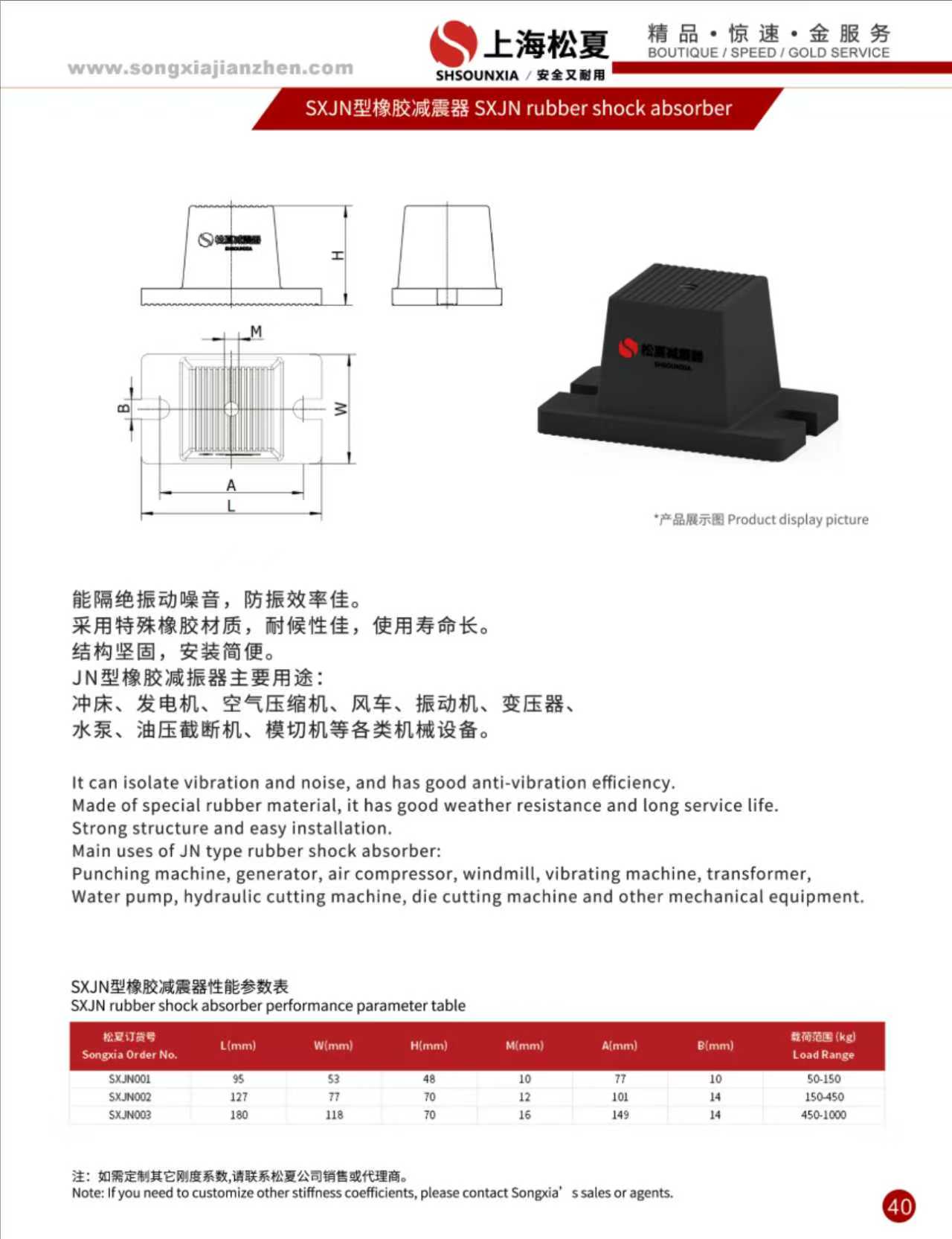 RM型橡膠隔振器: 特點:具有橡膠剪切承壓性能和過負荷保護壓縮性能,整體成型,上端有螺紋安裝孔,下端有防滑底板,所有金屬件覆蓋氯丁橡膠,防腐蝕。 應用:適用于減少噪聲和高頻率振動場所,如轉速大于480轉/分的風機、立式臥式水泵、冷水機組、空壓機等。 每種型號的橡膠減振器都有其獨特的設計和技術參數,選擇合適的減振器應基于具體的應用場景、負載條件、空間限制等因素進行綜合考慮。此外,隨著技術的發展,市場上可能會出現更多新型號和改進型的船用橡膠減振器,因此建議在選購時咨詢我們松夏專業工程師。